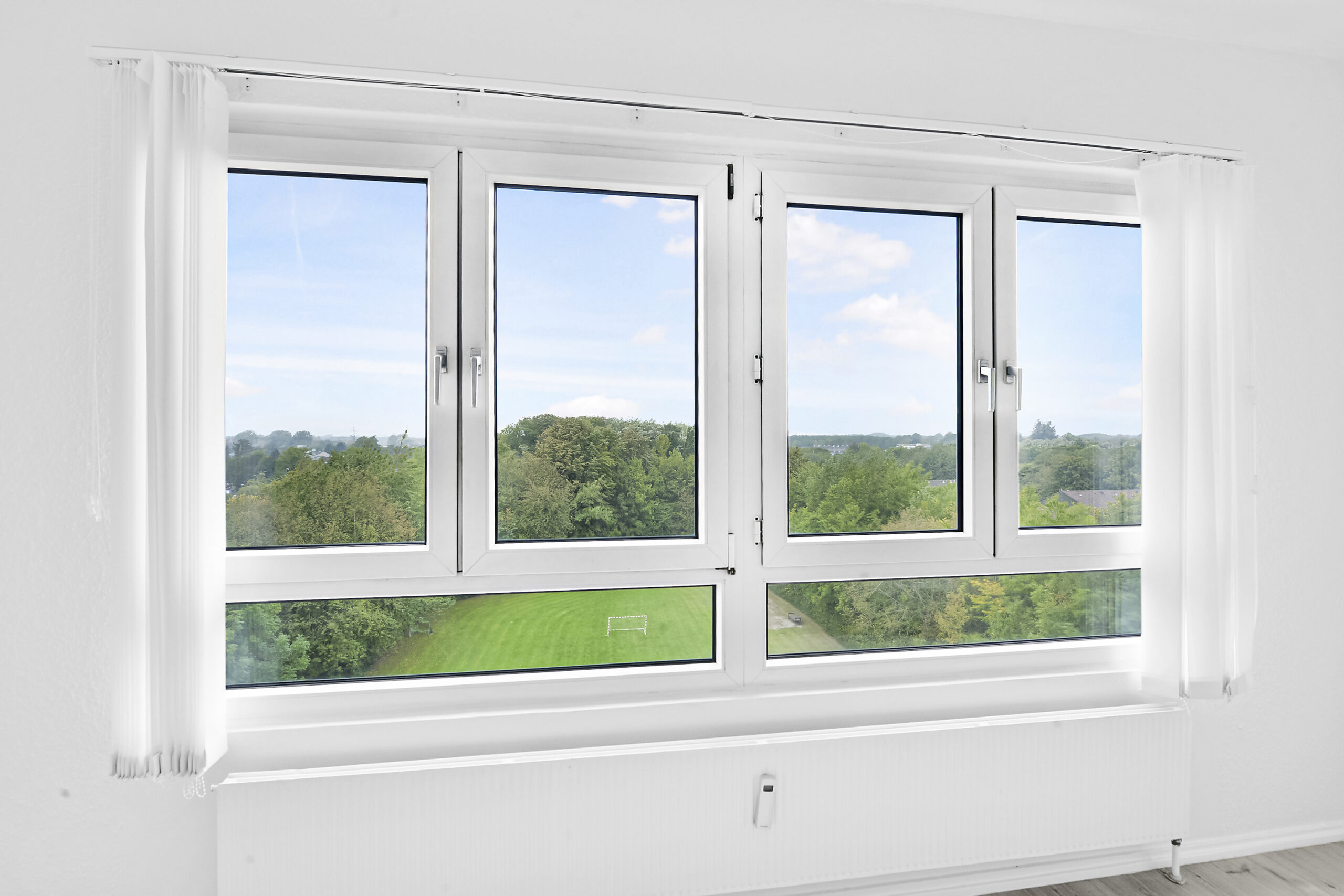 Denne lejlighed har i stuen et pænt højt dobbelt vinduesparti – med 2 vinduer, der kan åbnes hhv. højre og venstre ind – det giver MEGET af en altan, man kan faktisk ligge på et underlag på gulvet og sole sig, man kan stille et spisebord hen ved det åbne vindue, og så har man i stuen HELE altan funktionen – og det helt uden generende blade nedfald om efteråret ( man bor alt for højt oppe ). Fordelen er helt klar, man har ikke, og betaler ikke for en altan, der kun bruges ca. 3 måneder om året.