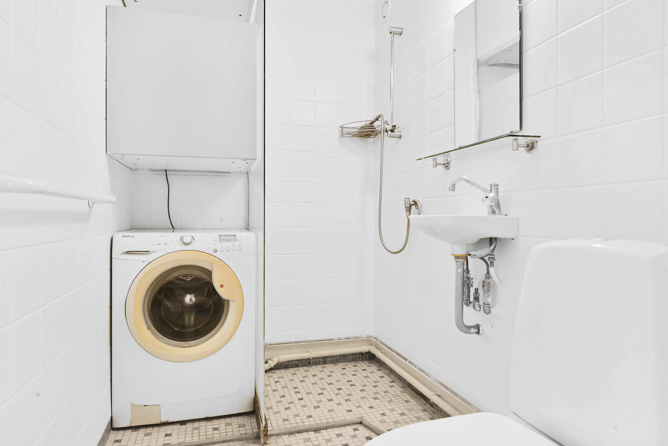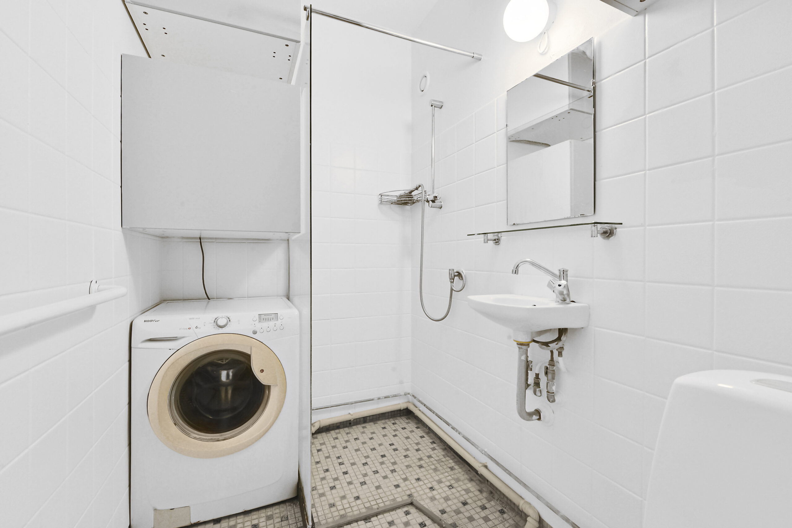 Pænt rummeligt badeværelse med hvide fliser, stående brus, toilet og håndvask.