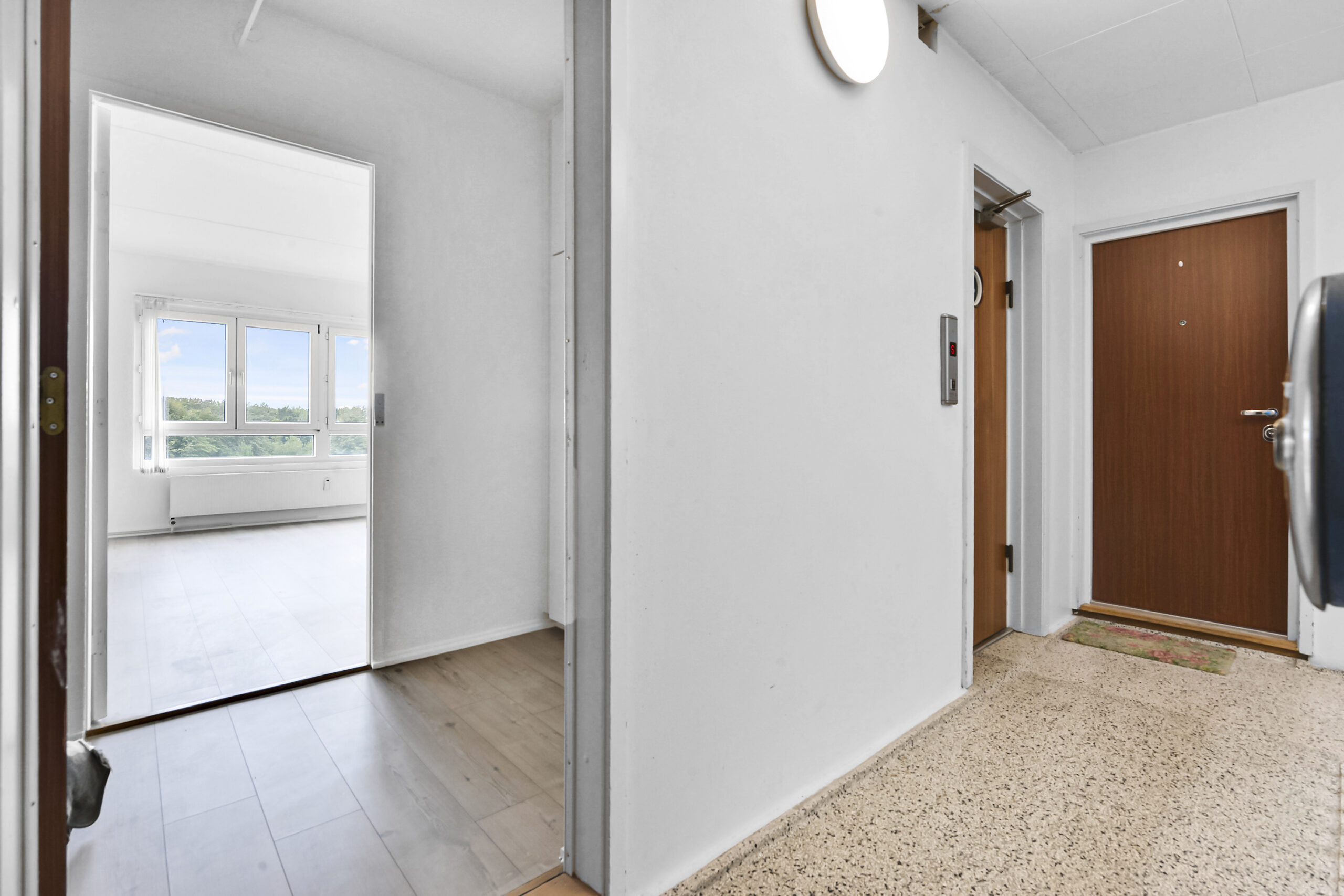 Allerede når du træder ind i opgangen, oplever du en klar fornemmelse af kvalitet, og der er naturligvis hurtiggående elevator, der hurtigt bringer jer til denne lækre 2 værelses lejlighed, penthouse – ingen over.